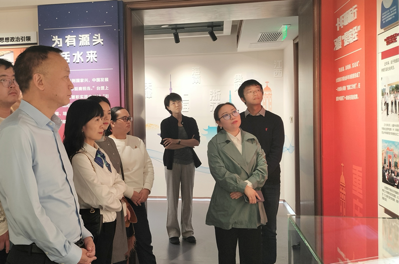 11日下午,王昱带领与会同志参观台盟历史陈列馆,台盟中央宣传部副部长王若鲲参加活动。台盟历史陈列馆于2022年10月开馆,有上百件实物、千余幅图片和大量视频资料,是展示台盟发展历程,体现与党同心奋进,弘扬优良传统,深化盟史滋养的重要载体和平台。台盟盟史讲解员、台盟重庆市委会内部监督委员会委员连海平现场为大家进行讲解。他从“海峡激流·同道相成创建台盟”开始,将台盟从“二二八”起义中走来、响应中共“五一口号”、作为一个党派参加新政协、见证中华人民共和国的诞生,与中国共产党风雨同舟、一路同行的历史娓娓道来,并结合自身的体会感悟,表达了爱国爱乡的情感和期盼祖国和平统一的愿望。当听到台盟创始人谢雪红的会议原声录音后,他非常有感慨地说:“她的口音和我爷爷的家乡口音特别像啊”。台盟重庆市委会青委会副主任、重庆市台联副会长吴慧表示:“虽然以前参与了不少盟内学习和参政议政工作,但这是第一次来到台盟历史陈列馆,望向一幅幅珍贵的历史图景,更能深切地感受到心灵的震撼,触发情感的共鸣,重拾乡愁的记忆,坚定祖国统一的信心。知所从来,方明所往,我们一定不忘合作初心,永远跟着中国共产党前进”。